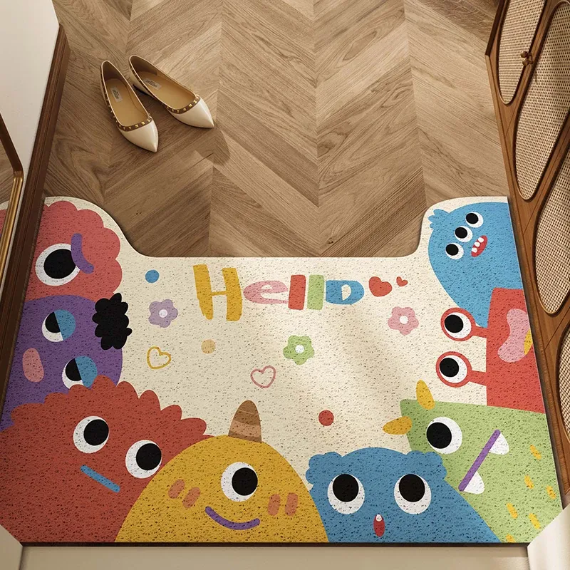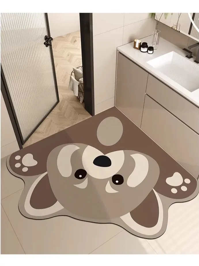 カワイイカートゥーンデザインのバスルームマット!扇形の角で、吸水性抜群の珪藻土カーペット。トイレの入り口に最適な滑り止めマットで、安全性もバッチリ!おしゃれで実用的なトイレ用品をお探しの方におすすめです。