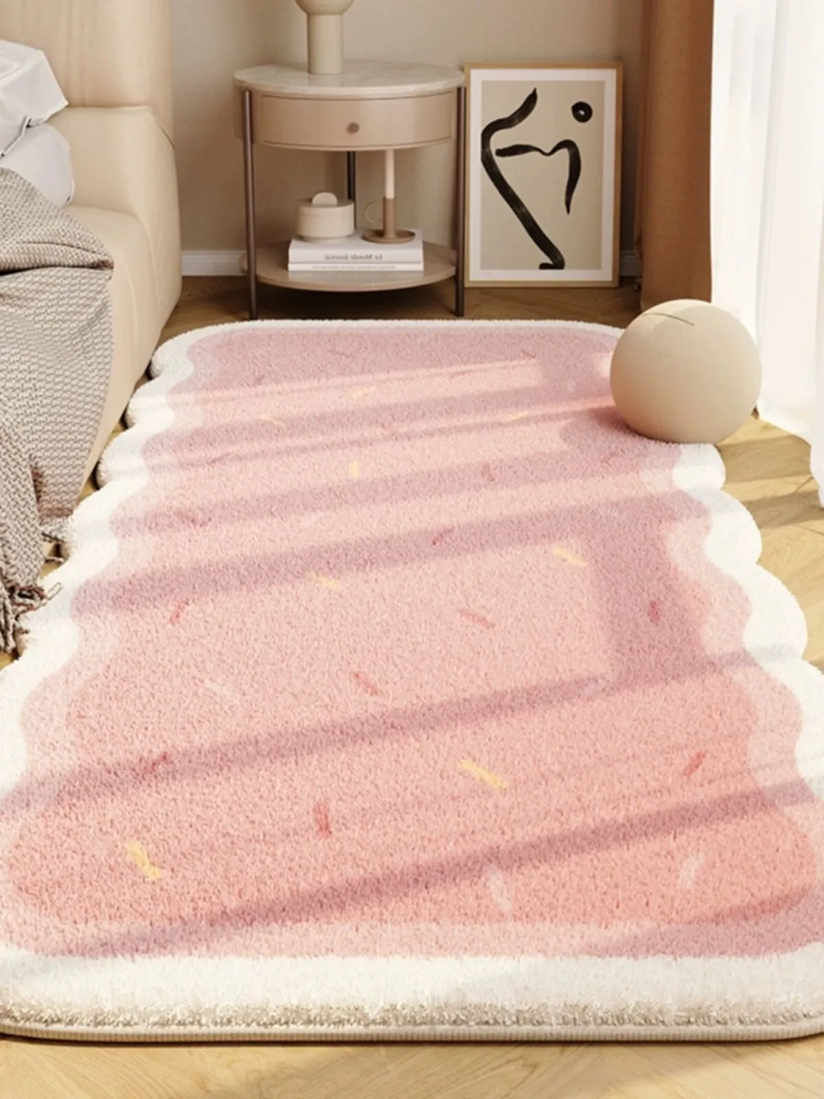 クリーミーピンクのベッドサイドマット - 冬の暖かさを感じる滑り止めデザイン!おしゃれな異形カーペットで、寝室やリビングにぴったり。ソファの足元を優しく包み込む、心地よい空間を演出します。