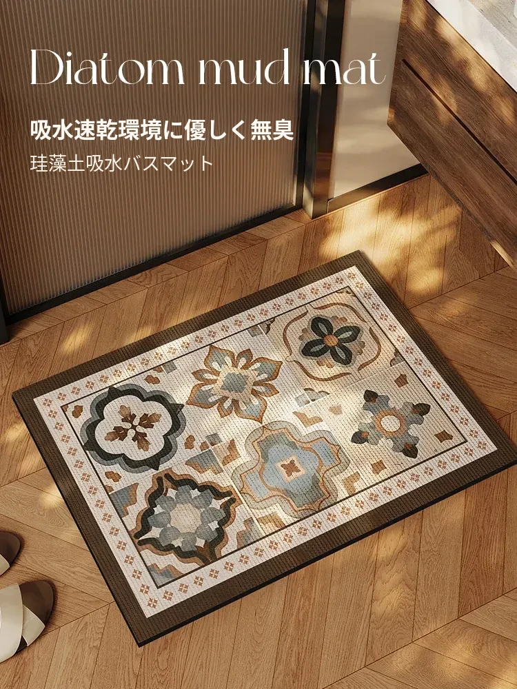 アメリカンレトロフラワータイルバスルームマット - トイレ用シリカゲル速乾フットマット、吸水性抜群で滑り止め機能付き!おしゃれで機能的、衛生的なバスルームの必需品です。