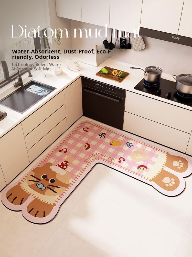 Cute Pink Cat L-Shaped Kitchen Mat - Absorbent, Customizable Diatom Mud Corner Carpet for a Trendy Home Decor! Perfect for adding charm and style to your kitchen!