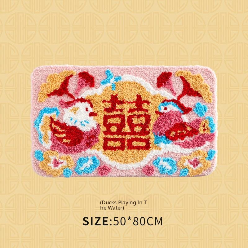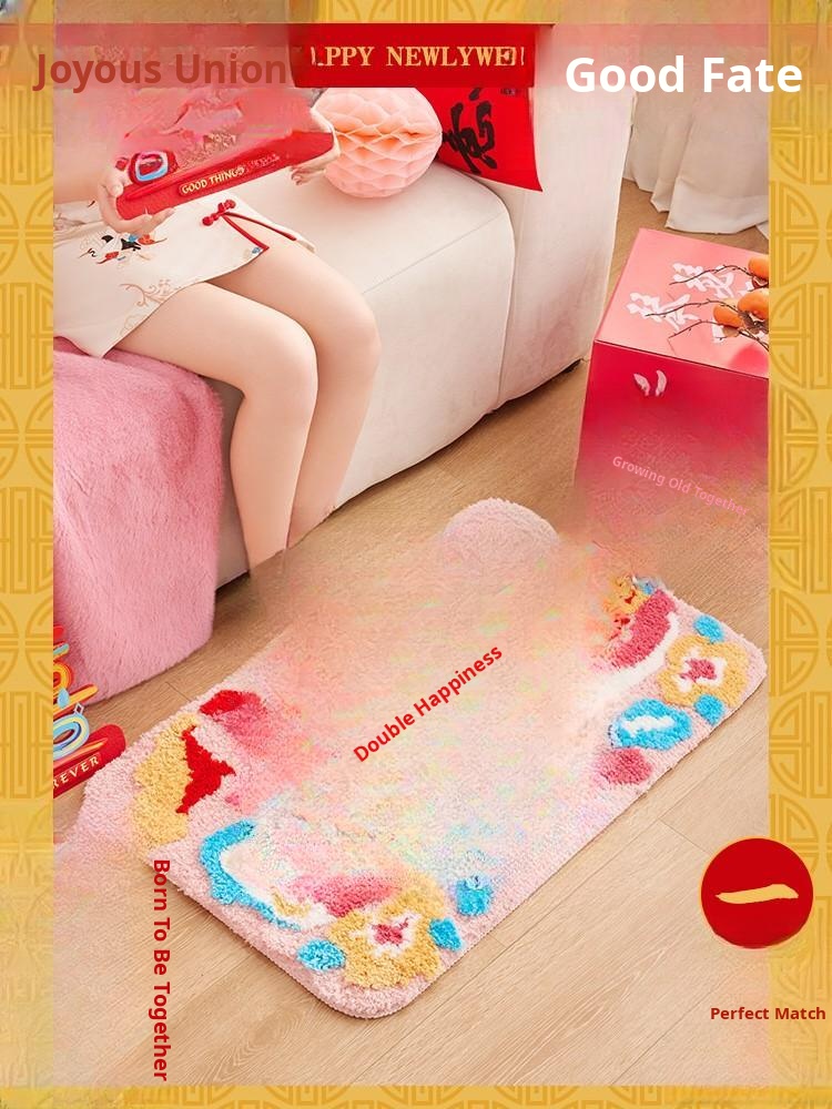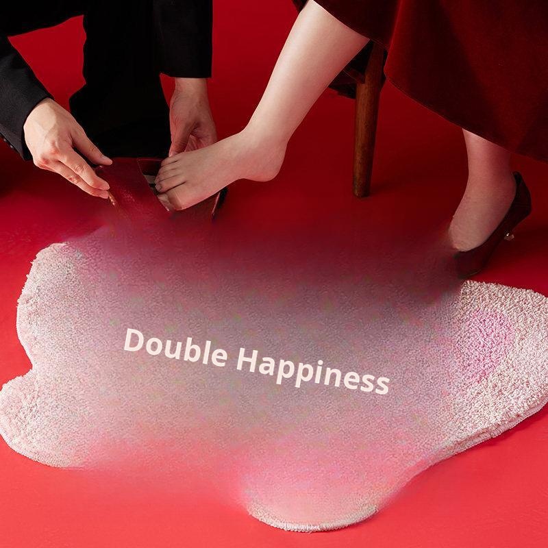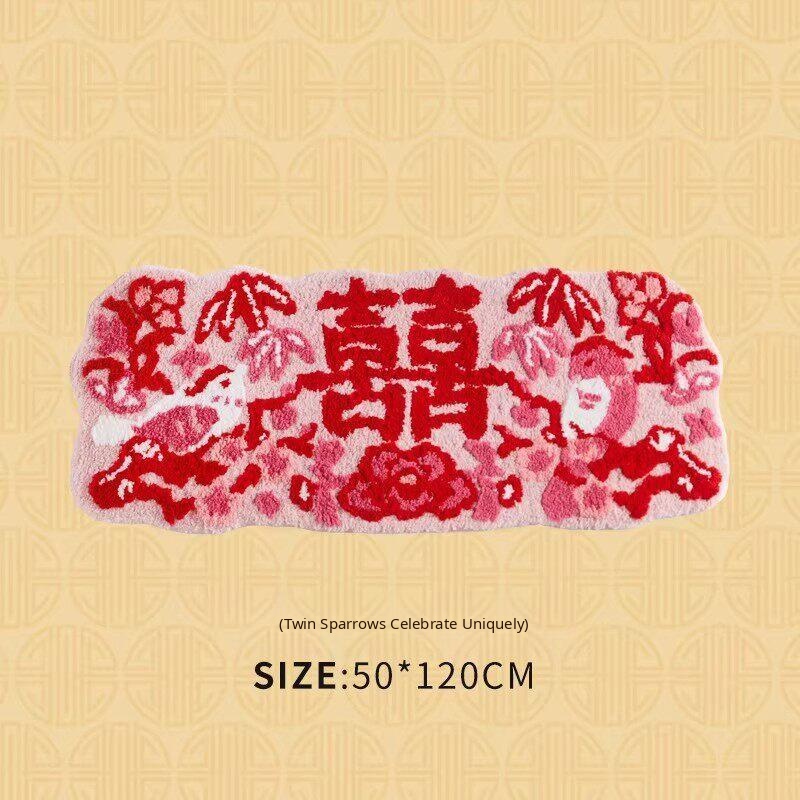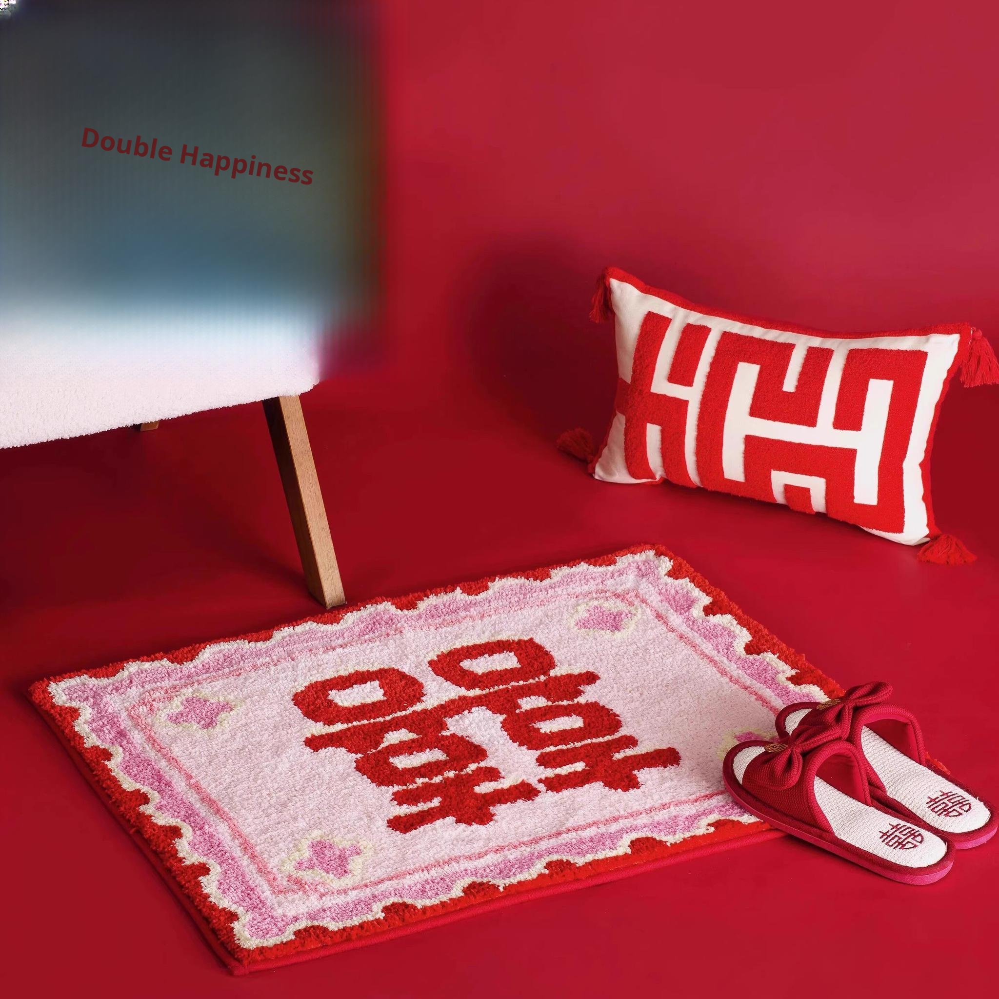 Red Double Happiness Wedding Doormat - Festive Decorative Mat for Bedroom and Marriage Room, Absorbent Non-Slip Velvet Carpet for Bedside