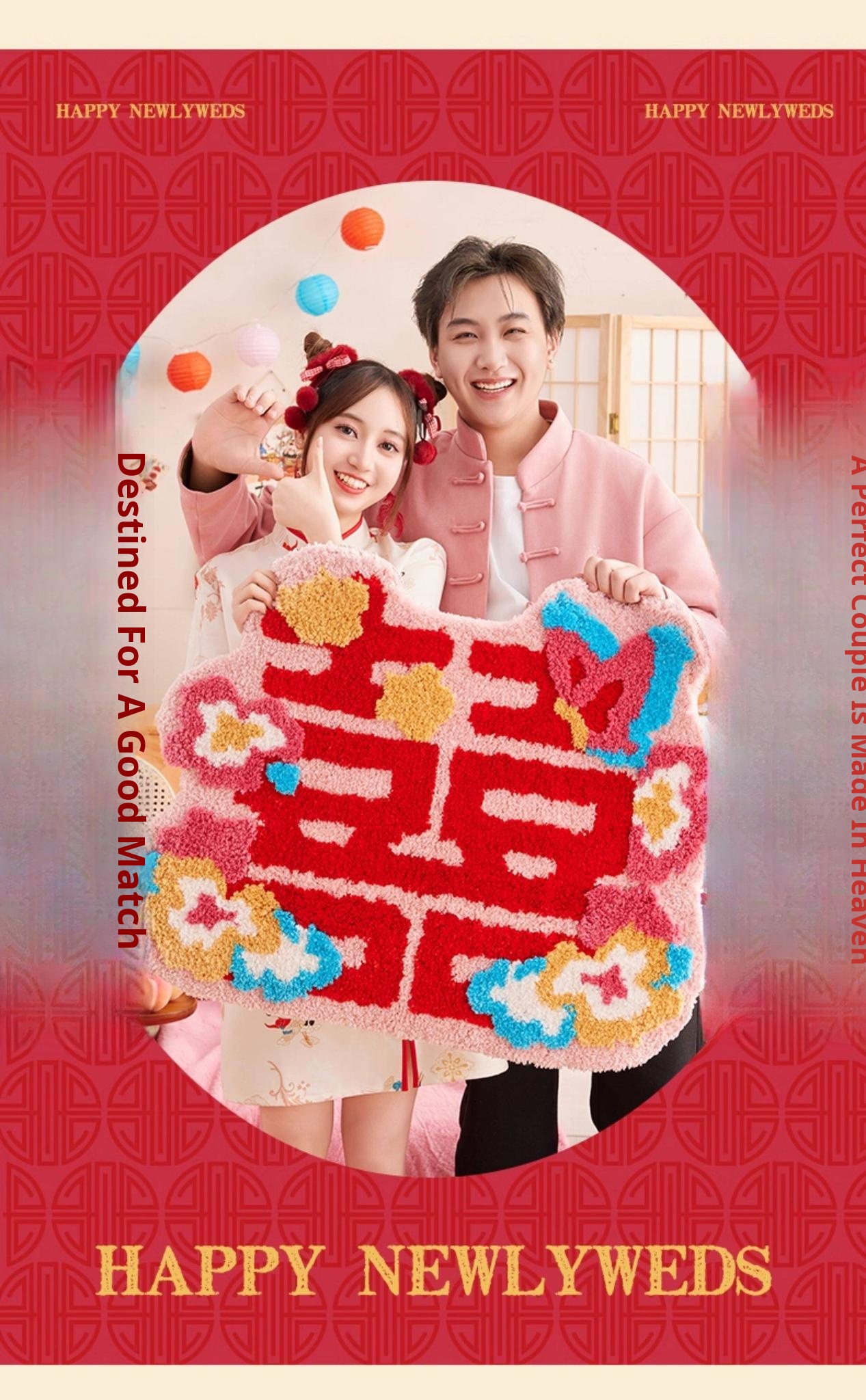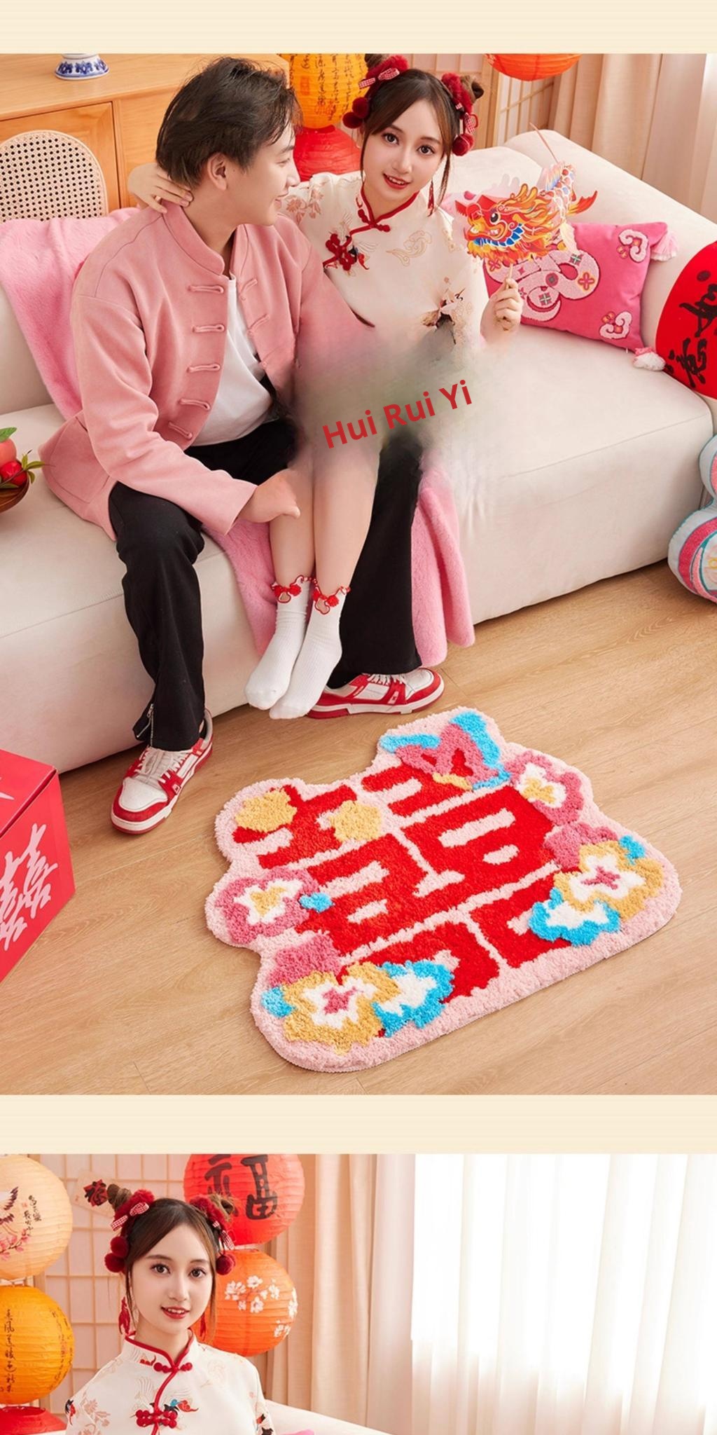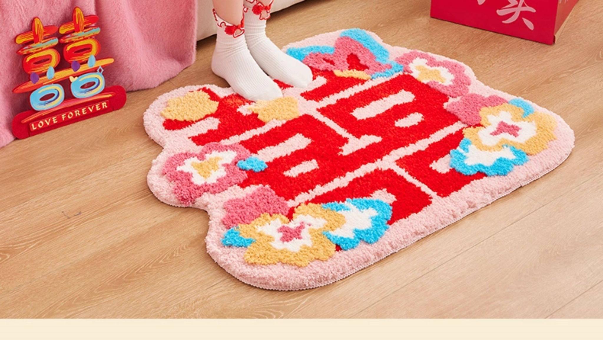 Festive Double Happiness Flocked Rug - Auspicious Ruyi Shape [24.41in*39.37in]