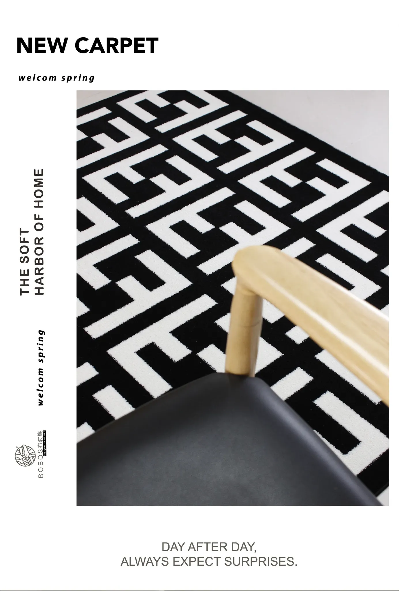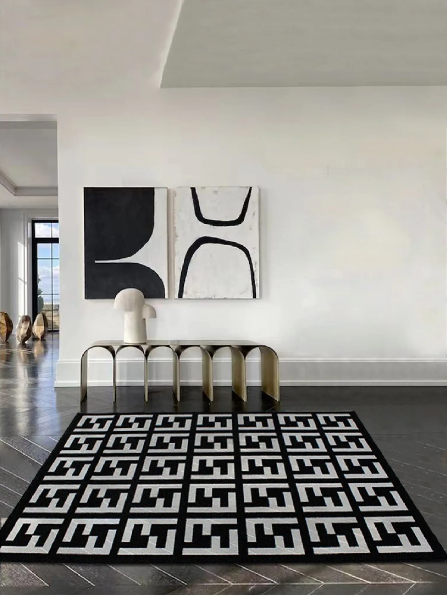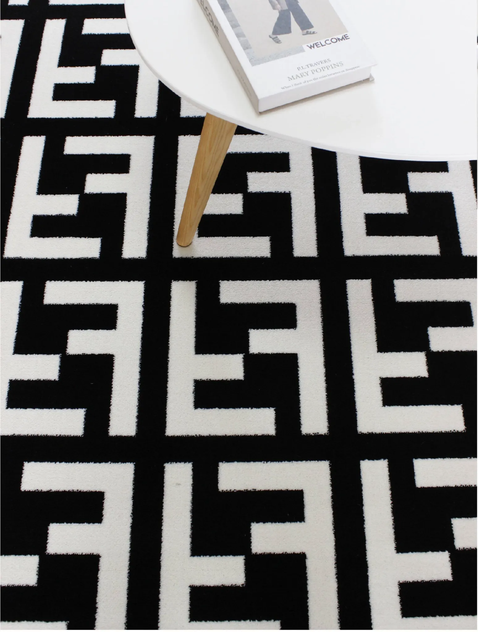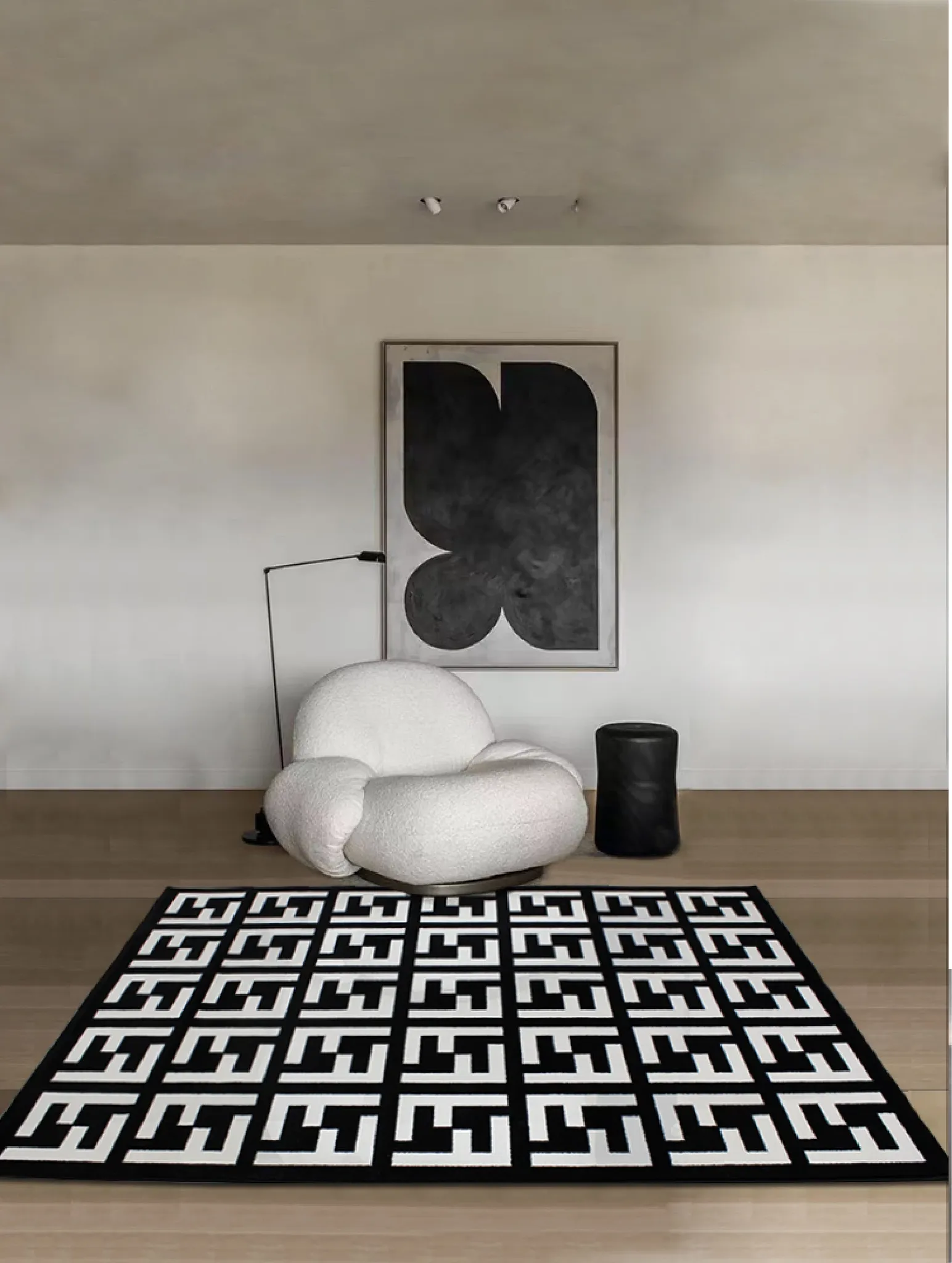 モダンで高級感あふれるポストモダンスタイルのラグ、北欧風のインスピレーションを受けたベッドサイドマット。シックなブラック&ホワイトのデザイン、大きなクッションのような心地よさで、リビングや寝室にぴったりのアイテムです!