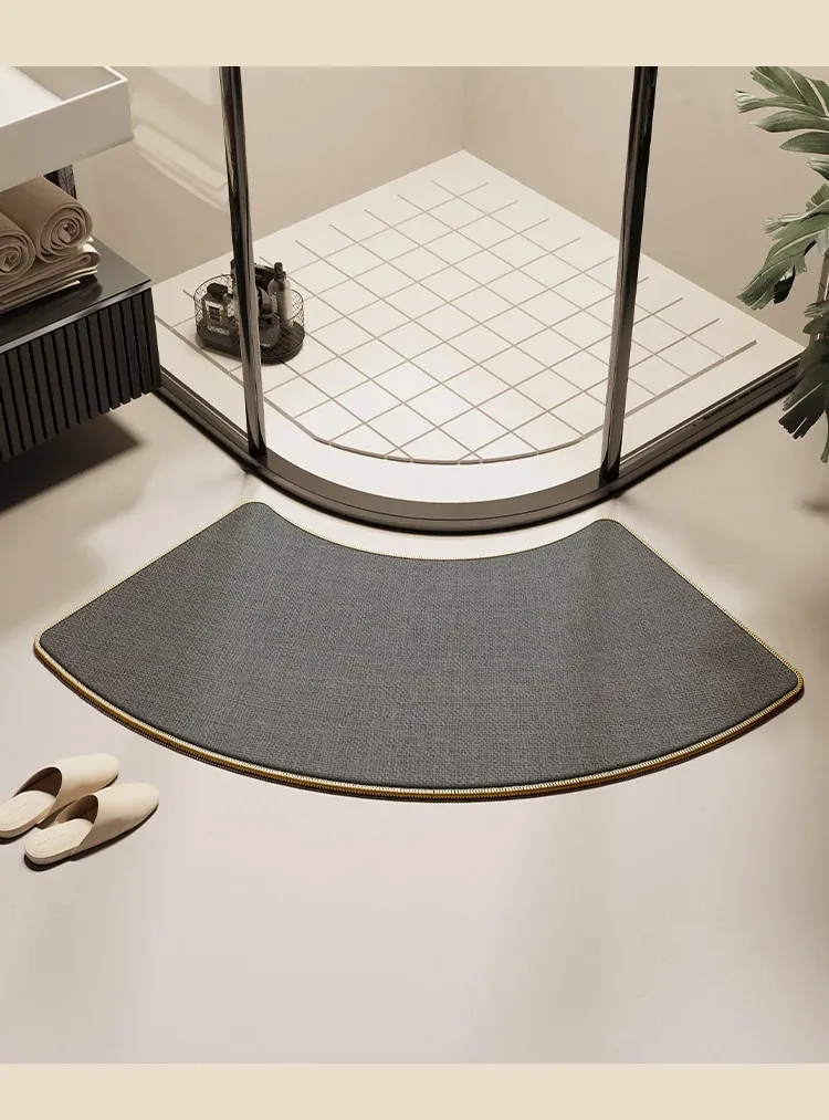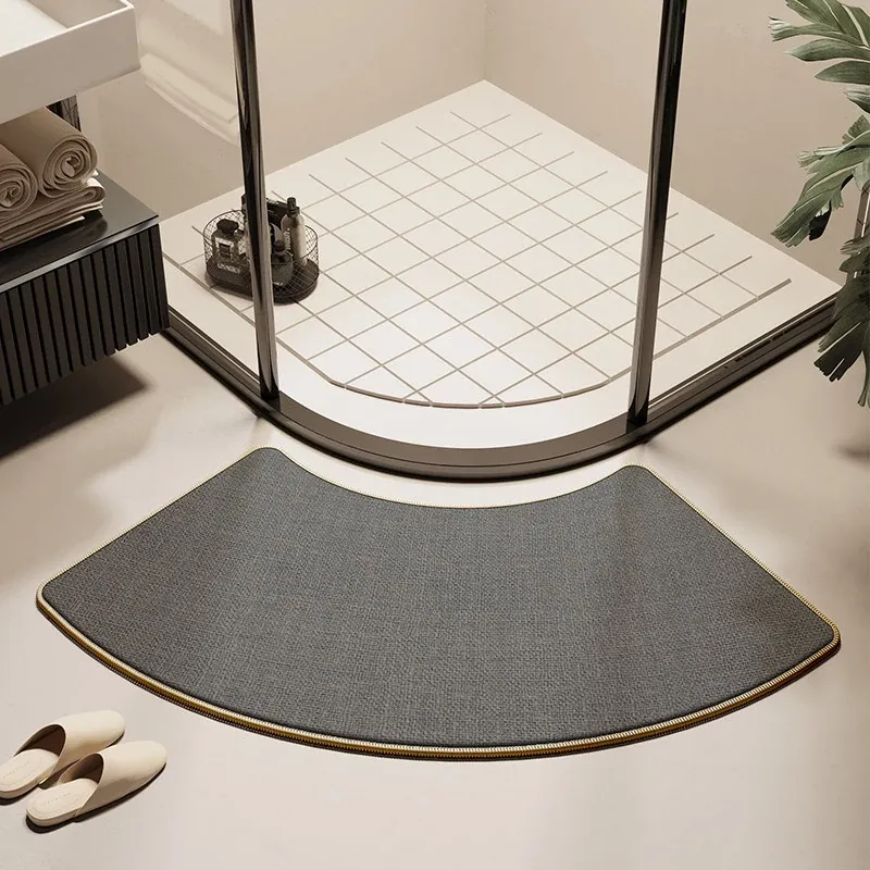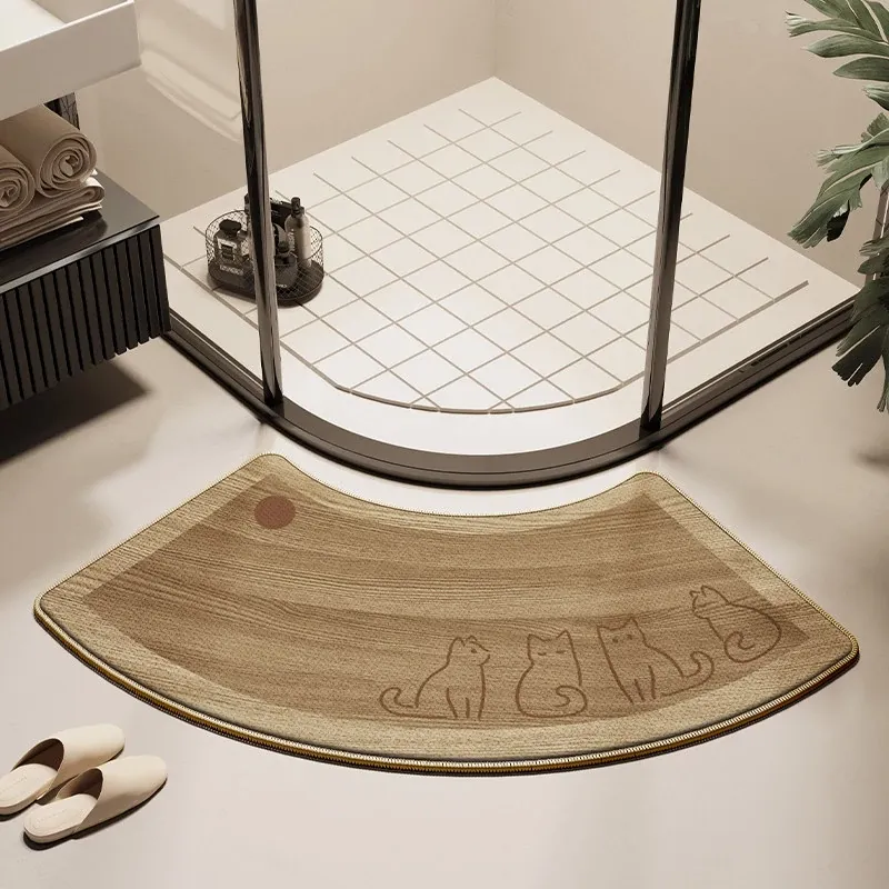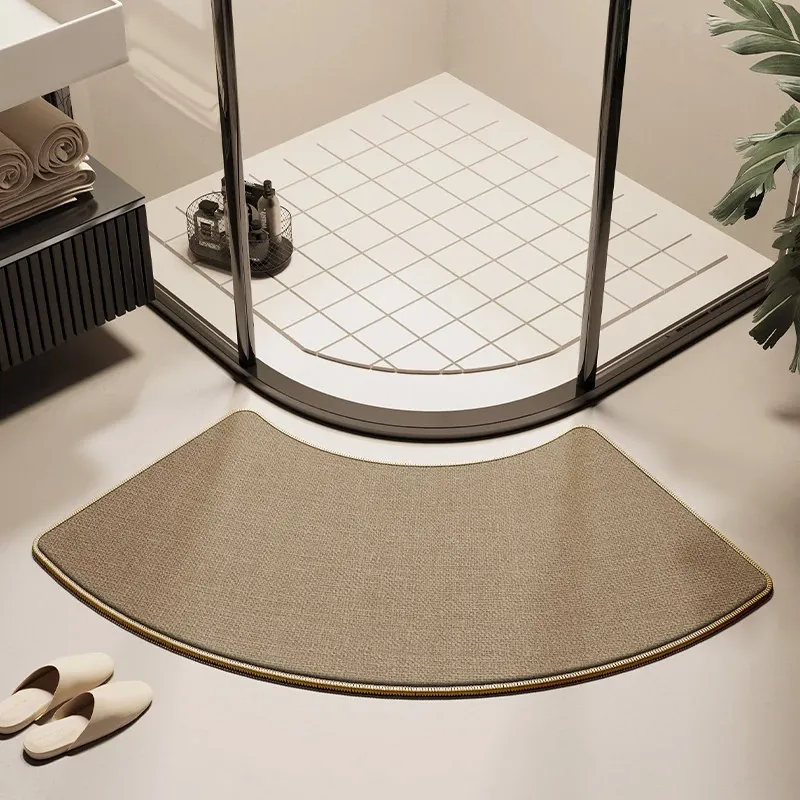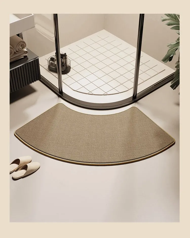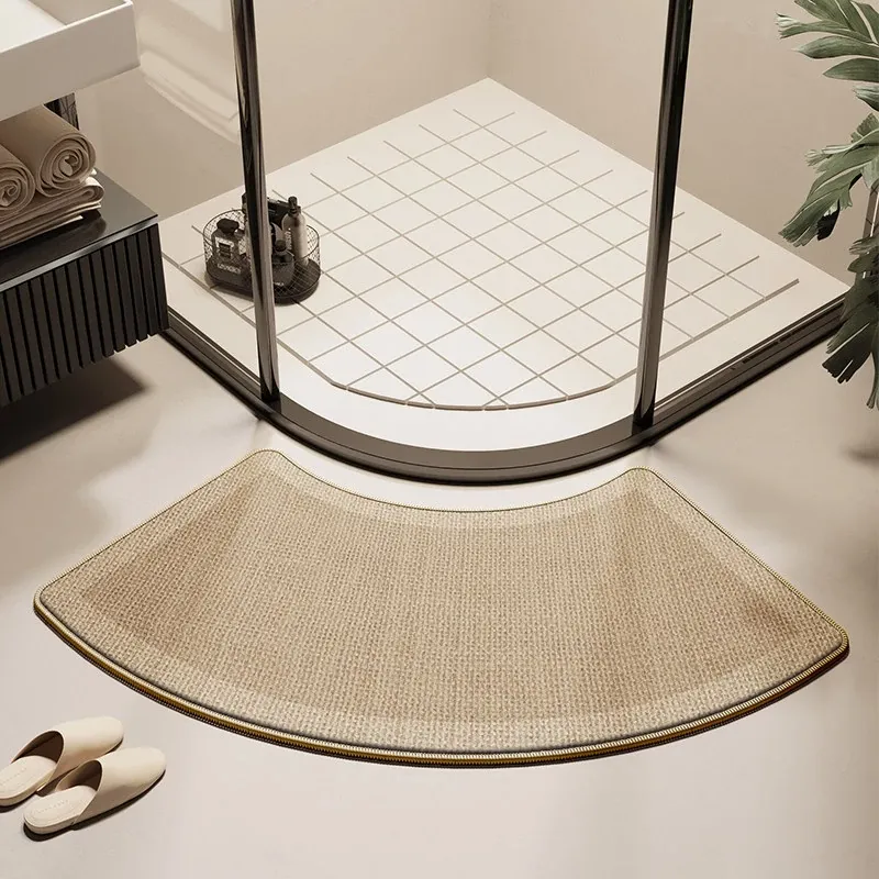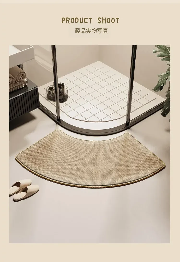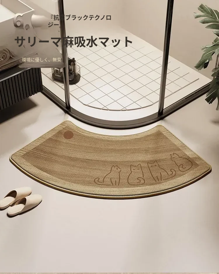 天然木目デザインのアーチ型バスルームマット - 滑り止め・吸水性抜群!シャワールームやトイレに最適なリネン編みの速乾ファンシェイプラグ。快適な足元でおしゃれな空間を演出!